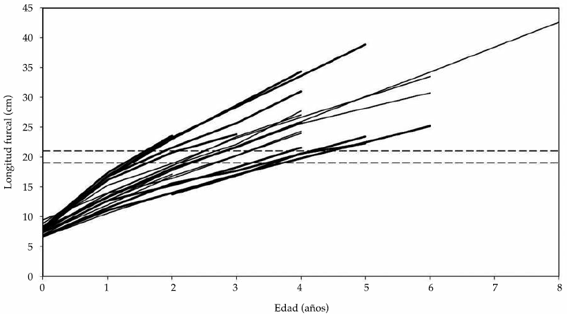 Comparando edades y longitudes medias por clase de edad, se obtuvo una familia de curvas talla-edad para la trucha (figura 6), donde se observa la escasez de individuos de más de cuatro años. Asimismo, se comprueba que para las tallas mínimas pescables que actualmente se aplican en la cuenca para la trucha común: 21 cm en los cotos de Mondoñedo y Celeiro y aguas abajo, 19 cm para el resto de la cuenca (Xunta de Galicia, 2013), los ejemplares muestreados se encuentran en un rango de edades entre 1+ y 4+ para los cotos de Mondoñedo y Celeiro, mientras que están en un rango de edades entre 1+ y 3+ para el resto de la cuenca. Es decir, se está autorizando la captura de truchas de la clase de edad 1+, que no han tenido ocasión de reproducirse antes de ser capturadas. Esto supone una presión excesiva sobre la población y probablemente se está dificultando su normal regeneración. Examinando las curvas talla-edad se comprueba que con una talla mínima de captura de 23 cm para toda la cuenca, se asegura que cualquier trucha capturada legalmente tenga al menos edad 2+ y es probable que haya tenido ocasión de reproducirse antes de la captura. La propuesta de talla mínima de captura no parece aventurada, toda vez que en la vecina cuenca del Eo, la normativa establece una talla mínima de 25 cm para la trucha (Xunta de Galicia, 2013) y existen propuestas desde hace tiempo dirigidas al mantenimiento de cohortes más numerosas de reproductores para hacer a las poblaciones de peces más resistentes a las perturbaciones y para evitar una sobreexplotación no detectada (Arlinghaus, Matsumura, & Dieckmann, 2010).