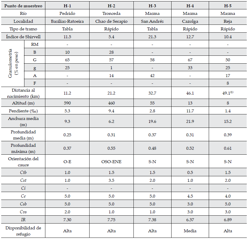 La mayor parte de los puntos de muestreo para caracterización del hábitat (H-1 a H-5) se hallaba en zonas de rápidos (valor del índice de Shirvell superior a 9), aunque la apreciación visual previa indicara en algunos casos que se trataba de zonas de tablas. En el lecho se encontró cuarcita, pizarra y granito, tal como indican Río-Barja y Rodríguez-Lestegás (1992), junto con algunas vetas de caliza en la zona oriental de la cuenca, predominando en cuanto a granulometría las gravas, además de bolos, bloques y gravillas en el curso alto, así como gravillas, arenas y limos en el curso bajo (cuadro 1). En cuanto a estabilidad de las partículas, casi todas las fracciones eran móviles, sobre todo las gravillas. El sustrato del lecho era idóneo para la freza, dado su bajo recubrimiento por finos.