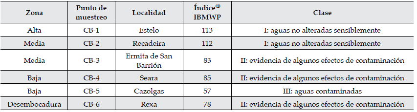 El agua resultó ser apta para la vida de los peces en casi toda la cuenca. Según el índice IBMWP, la calidad biológica del agua se reduce al descender en el río (cuadro 2), de modo que el Masma es de clase I (aguas no contaminadas) por su índice IBMWP en los puntos CB-1 y CB-2; mientras que aguas abajo, en el punto CB-3, pasa a clase II, probablemente debido a los vertidos urbanos de Mondoñedo; el río no es capaz de autodepurarse a continuación, pues el índice del punto CB-4 es muy próximo al del punto CB-3. En el punto CB-5, el índice biológico es propio de aguas contaminadas, no aptas para la vida de los peces, tal vez debido a un mal funcionamiento de la depuradora de Lorenzana. En el último punto de análisis (CB- 6), el río se ha autodepurado de modo parcial, ya que asciende a clase II. En la zona de la ría, la posible contaminación por metales pesados no procede del río sino principalmente de la costa (Prego & Cobelo-García, 2003).