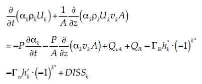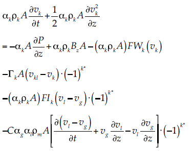 (1)Donde ρ denota densidad; α, fracción volumétrica; A, área de flujo; ν, velocidad, y Γ es la transferencia de masa interfacial (evaporación/ condensación), determinada a través de una condición de cerradura.