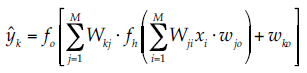 (1)La expresión explícita de un valor de salida de una FFBP es dada por: donde wji = peso de conexión de la capa oculta de la i-ésima neurona de la entrada a la j-ésima neurona de la capa oculta; wjo = sesgo de la j-ésima neurona oculta; fh = función de activación de la capa oculta; wkj = peso de conexión de la capa de salida de la j-ésima neurona de la capa oculta a la k-ésima neurona de la capa de salida; wko = sesgo para la k-ésima neurona de salida, y fo = función de activación de la capa de salida. Los pesos son diferentes para cada conexión y sus valores pueden ser cambiados durante el proceso de entrenamiento (Kim & Valdés, 2003). En la figura 3 se presenta de modo esquemático una ANN FFBP alimentada hacia adelante con entrenamiento de retropropagación de los errores.
