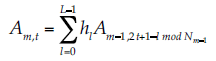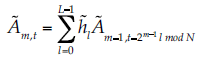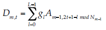 (13)donde t = 0, 1, …, NJ – 1, Am,t es la aproximación de la señal en la escala m, posición diádica t, Dm,t es el detalle para los mismos parámetros. L es la longitud del filtro y el índice (m – 1, 2t + 1 – l mod Nm-1) significa el submuestreo y remuneración diádica, y la función mod es el módulo aritmético para realizar la convolución. El proceso de reconstrucción es la transformada inversa.
