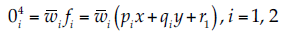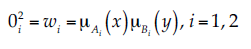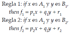 (2)donde x y y son las entradas al nodo i (i = 1, 2), Ai y Bi son niveles lingüísticos caracterizados por una función de membresía apropiada; pi, qi y ri son los coeficientes de la combinación lineal en el sistema de inferencia tipo Sugeno; también son llamados parámetros consecuentes.