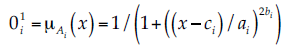 (3)donde 01i es la MF de Ai y especifica el grado en que x satisface el cuantificador Ai, el superíndice uno significa la capa. Los parámetros ai, bi y ci (parámetros premisa) son los parámetros de la función de la MF, que cambian su forma; por lo usual se utiliza una campana de Gauss con valores de 1 y 0 como máximo y mínimo, respectivamente.