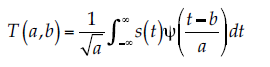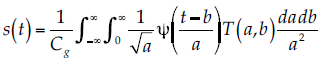 (8)donde y(t – b)/a es una función wavelet admisible y se utiliza para analizar la señal s(t). Los coeficientes de transformación T(a, b) son encontrados para una específica localización, t = b, y para un específico periodo wavelet, que es función de a, el parámetro de escala. El diagrama de T(a, b), con sus respectivos parámetros a y b es conocido como escalograma. Como en la transformada de Fourier, la señal original puede ser reconstruida usando la inversa: