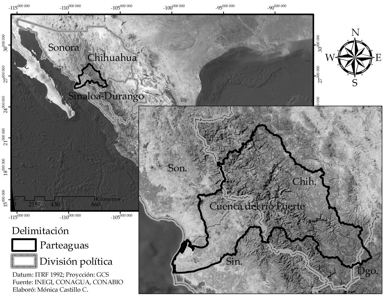La cuenca del río Fuerte se ubica en el noroeste de México, geográficamente entre 25.68° y 28.24° de latitud norte, y entre -106.12 ° y -109.43 ° de longitud oeste. El río Fuerte nace en la Sierra Madre Occidental, en los estados de Chihuahua, Durango y Sonora, y desemboca al norte del estado de Sinaloa, en el Golfo de California (figura 1). Las localidades más importantes económica y demográficamente dentro de la cuenca son Los Mochis, El Fuerte y Choix, en Sinaloa; Batopilas, Urique y Chinipas, en Chihuahua; El Vergel y Guadalupe y Calvo, en Durango, y Álamos, en Sonora.