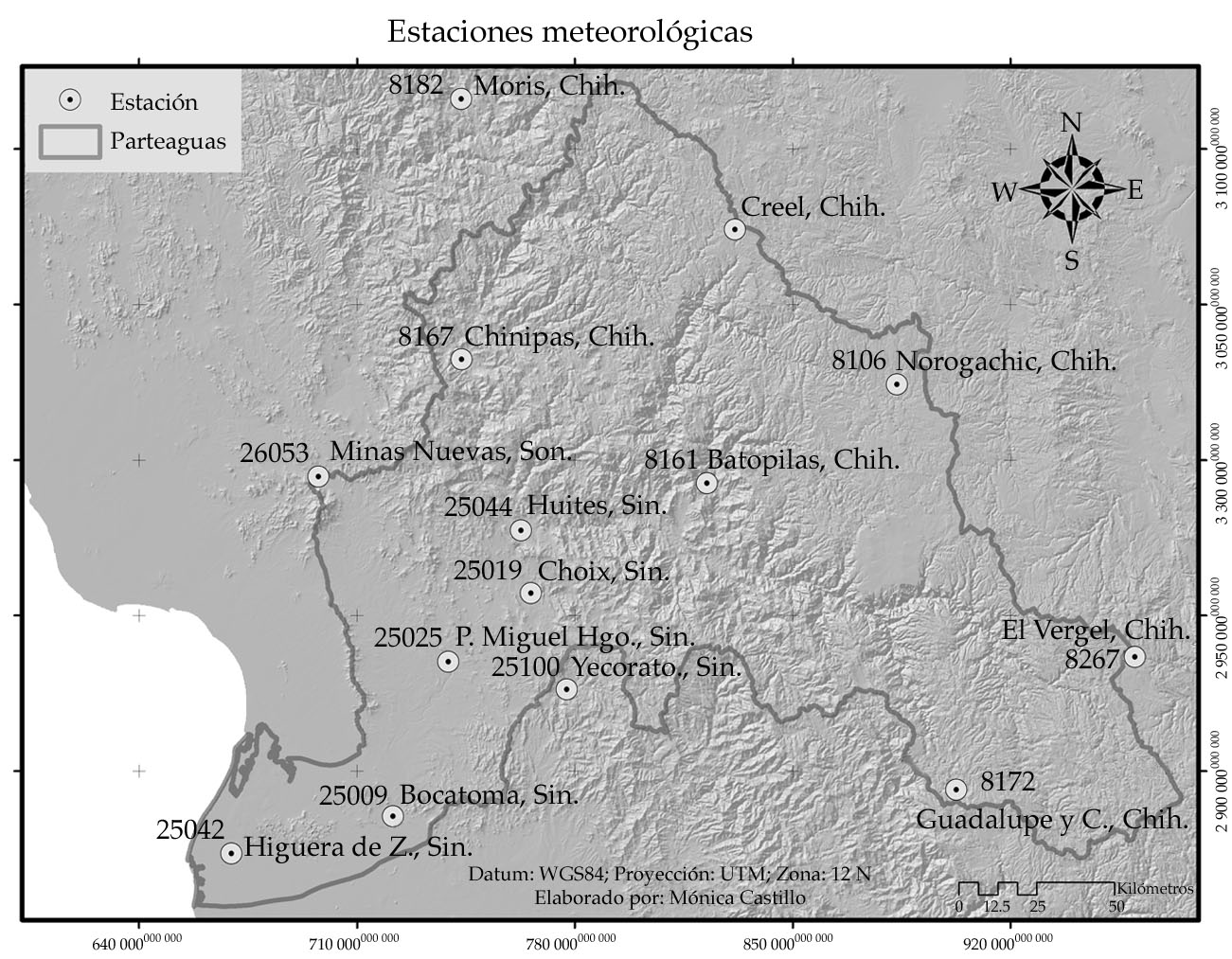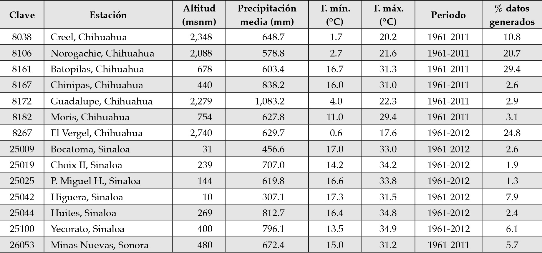 Se realizó el acopio de datos mensuales de precipitación, y temperatura mínima y máxima en el periodo 1961-2012 para 14 estaciones meteorológicas (cuadro 1), los cuales fueron obtenidos de la red de estaciones climatológicas del Servicio Meteorológico Nacional todos los días (SMN, 2014) y del ERIC III 2.0 (IMTA, 2009). La figura 2 muestra la distribución espacial de tales estaciones.