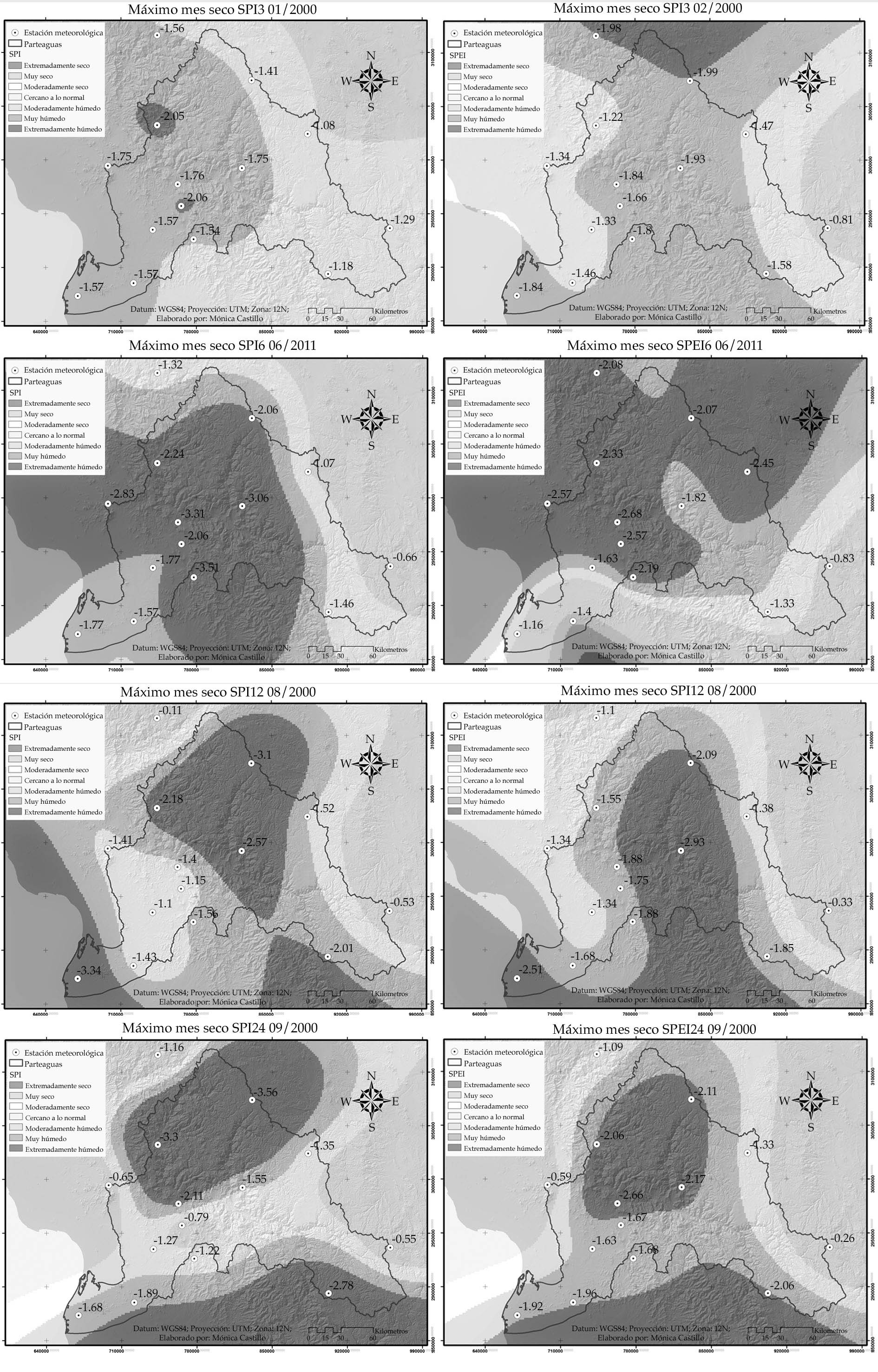 La figura 9 muestra la distribución espacial del SPI y SPEI durante el mes más seco en cada escala temporal, para 3, 12 y 24 meses. El estado de sequía más intenso ocurrió en el periodo de 1999 a 2004; para la escala de seis meses se presentó del año 2011 en adelante. Torrecillas, Miguel y Ravelo (2013), con el Índice de Severidad de Sequía de Palmer (PDSI) en el Organismo de Cuenca Pacífico Norte (OCPN) obtuvieron que de 1999 a 2008 se presentó sequía severa en Chihuahua, y sequía extrema en Sinaloa; la situación más crítica se tuvo de 2011 a 2013, con mayor impacto en la cuenca de los ríos Fuerte y Sinaloa. Ravelo, Sanz y Douriet (2014) señalan que mediante el SPI 12 y el PDSI en el OCPN, en el periodo 2011-2012 se presentó la sequía más extrema en la zona de estudio.