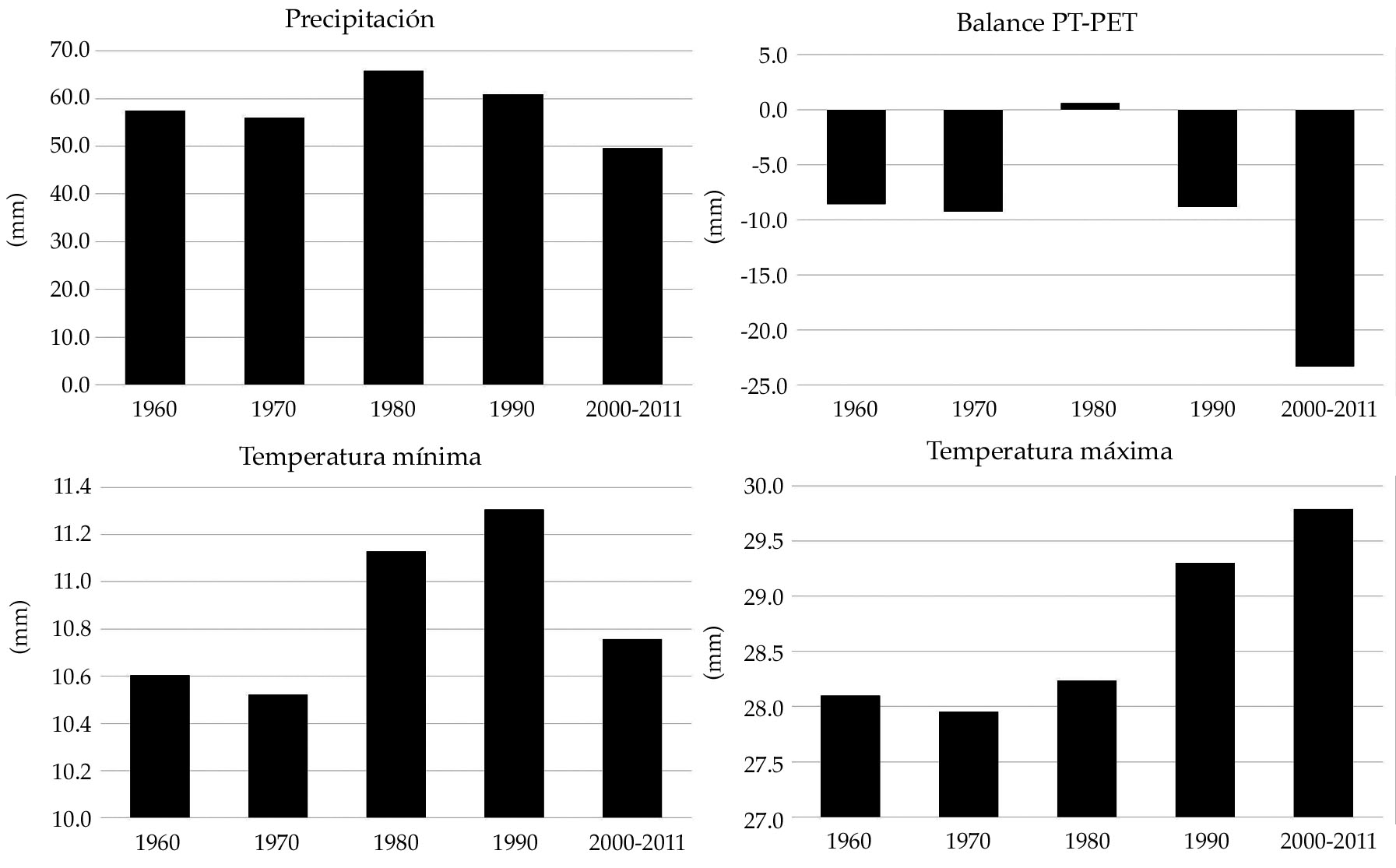 Se realizó el análisis de las variables que intervinieron en el desarrollo de los índices SPI y SPEI, mediante sus valores medios mensuales en cada década del periodo 1961-2012. En la figura 4 se observa que la precipitación media mensual tuvo su pico máximo en la década de 1980 y se ha reducido en las más recientes; el balance precipitación-evapotranspiración (Pt-PET) presenta en la última década las condiciones de mayor déficit del periodo estudiado; la temperatura mínima media mensual se redujo en casi 0.5 °C, en comparación de la década de 1990, y la máxima se ha incrementado gradualmente a partir de 1970. El comportamiento de la temperatura mínima se debe, según la Organización Meteorológica Mundial (OMM, 2013), a que durante el decenio de 2001-2010 no se experimentó ningún fenómeno de El Niño importante, que por lo normal se relaciona con el calentamiento del clima mundial. Hasta mediados de 2006 prevalecieron los episodios de La Niña y las condiciones neutras, seguidos de un breve episodio de El Niño. Esta variabilidad natural a corto plazo puede haber enmascarado algunos de los efectos del cambio climático a largo plazo. Sin embargo, el comportamiento de la temperatura máxima sí refleja esta tendencia, indicando mayor oscilación térmica en la última década.
