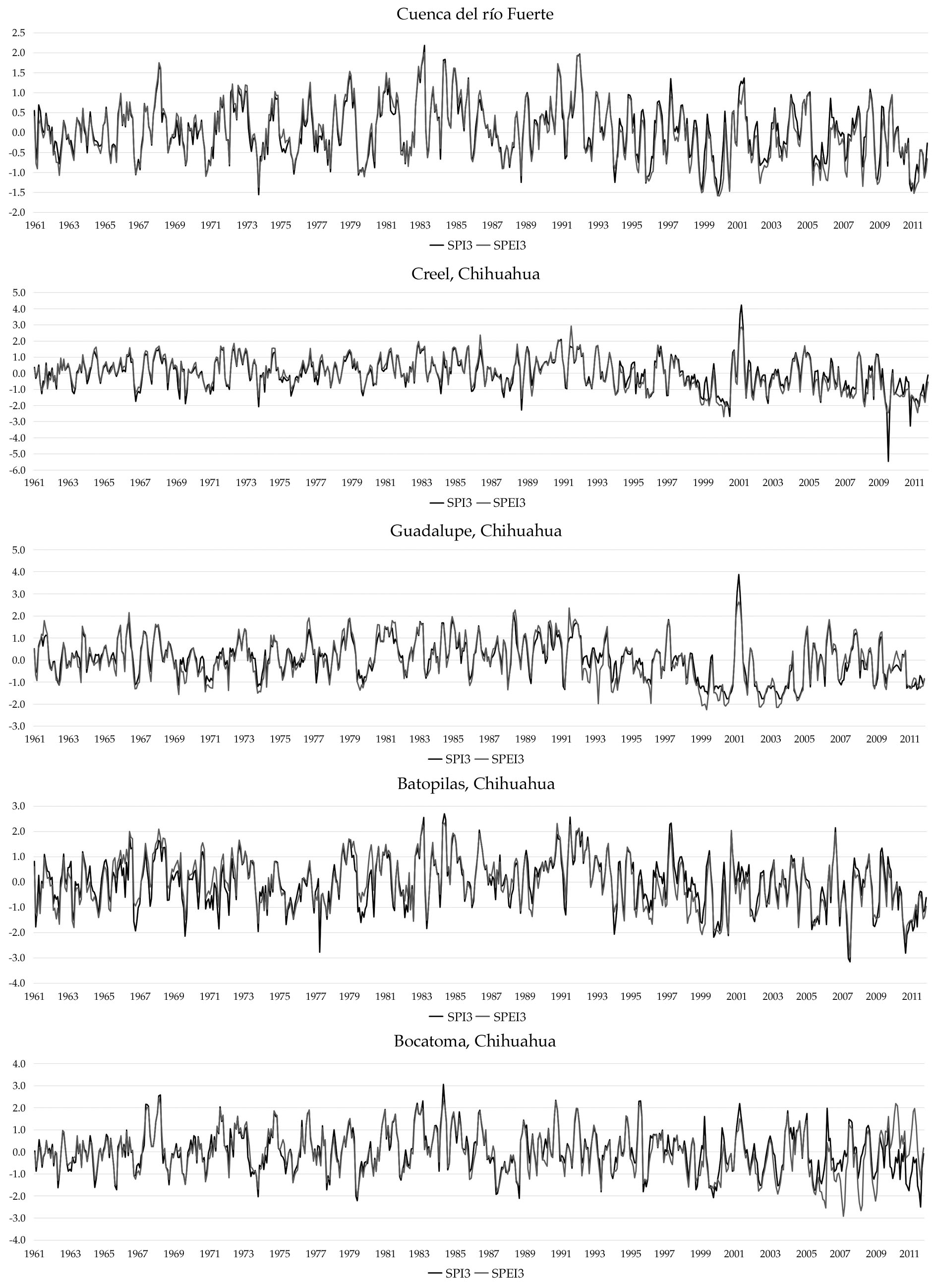 Al norte de la parte alta de la cuenca, la estación Creel, con una lámina de precipitación anual menor que Guadalupe, que se ubica al sur de la parte alta, presenta eventos secos extremos más intensos entre 1999 y 2011 que esta última. Los índices oscilan entre -5.0 y 3.0 en Creel, mientras que en Guadalupe se dan entre -3.0 y 3.0. En la parte media, la estación de Batopilas mostró eventos secos extremos de menor intensidad que Creel en el mismo periodo al final de la serie. Por su parte, el SPEI en Batopilas continúa mostrando al final de la serie mayor intensidad de los eventos secos y húmedos.