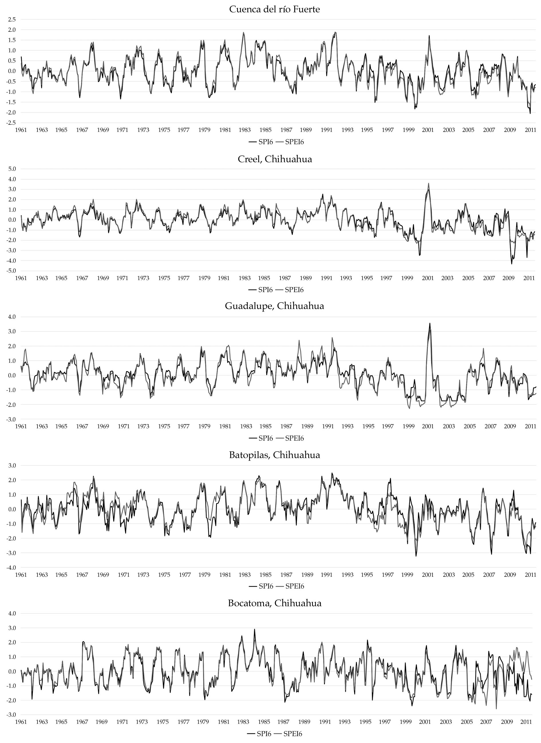 El SPI de seis meses presentó ocho periodos de sequía moderada, dos con sequía severa y una con sequía extrema al final de la serie. Las sequías severas empiezan a presentarse a partir de 1996 y aumentan considerablemente su intensidad y duración en los años siguientes. EL SPEI de seis meses definió nueve sequías moderadas y dos severas. La sequía más intensa se presentó en 2011 y su duración se extendió después del periodo de estudio.