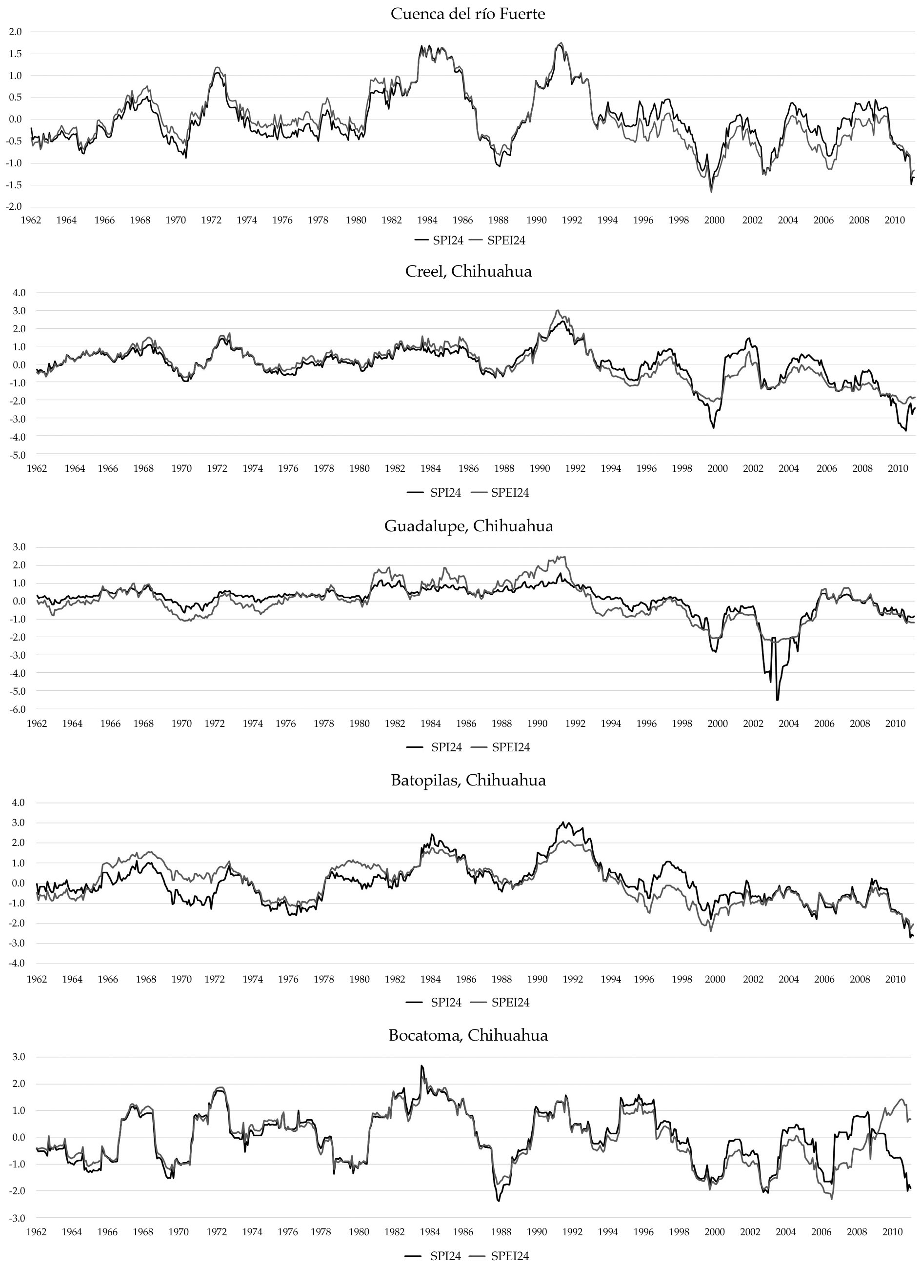 La mayor ocurrencia de sequías se presentó a partir de 1999 en todas las escalas temporales de ambos índices; pero, en general, se identifican dos periodos intensos de sequía en la cuenca: de 1999 a 2004 y de 2011 en adelante. Los tiempos reportados como sequía coinciden con los de Sthale et al. (2009) sobre la sequía en México, quienes señalan que la amplia y persistente sequía sobre el noroeste de México comenzó en 1994 y se mantuvo hasta 2009, haciéndola parecer la sequía más grave, sostenida y generalizada de todo el país. También, en Estados Unidos, Hao y AghaKouchak (2014) reportan que se identifican dos periodos de sequía recientes: 2007 y 2012. En 2007 se vieron afectados los estados de California, Missouri, Alabama y Florida. En 2012 se afectó toda la parte Central de Estados Unidos, incluyendo el estado de Texas; Hao y AghaKouchak (2014) usaron los índices SPI, Standarized Soil Moisture Index (SSI) y Multivariate Standarized Drought Index (MSDI) a 3 y 6 meses de escala.