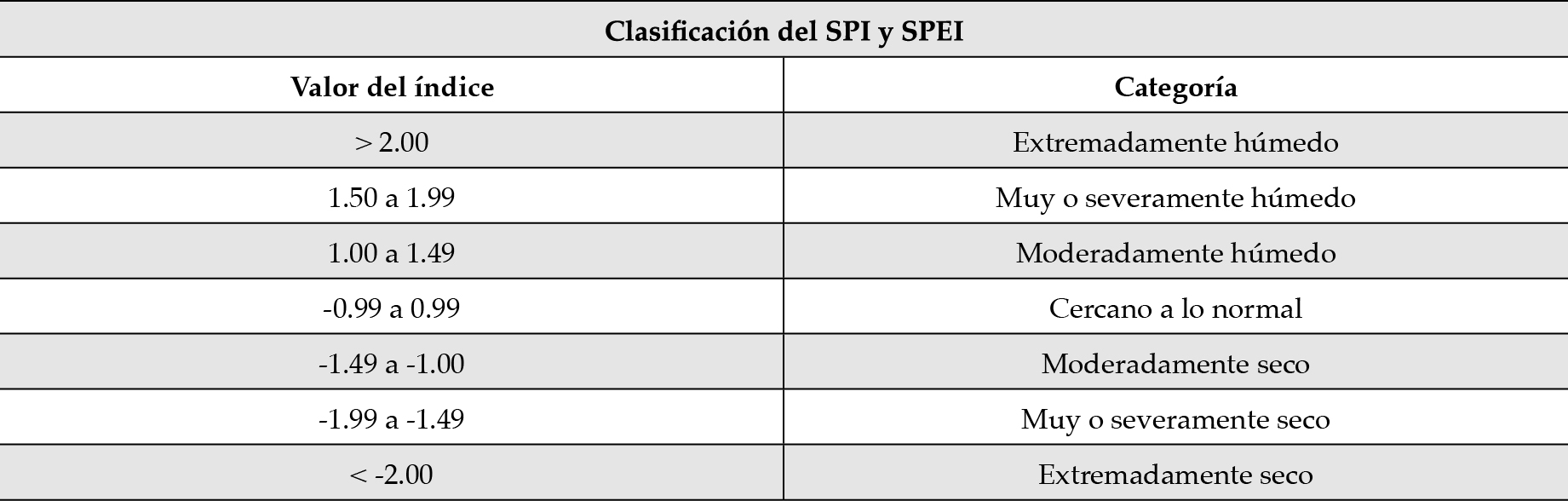 Los índices de sequía SPI y SPEI emplean la misma clasificación para las condiciones de sequía; la interpretación de los resultados se realizó con base en el cuadro 2.