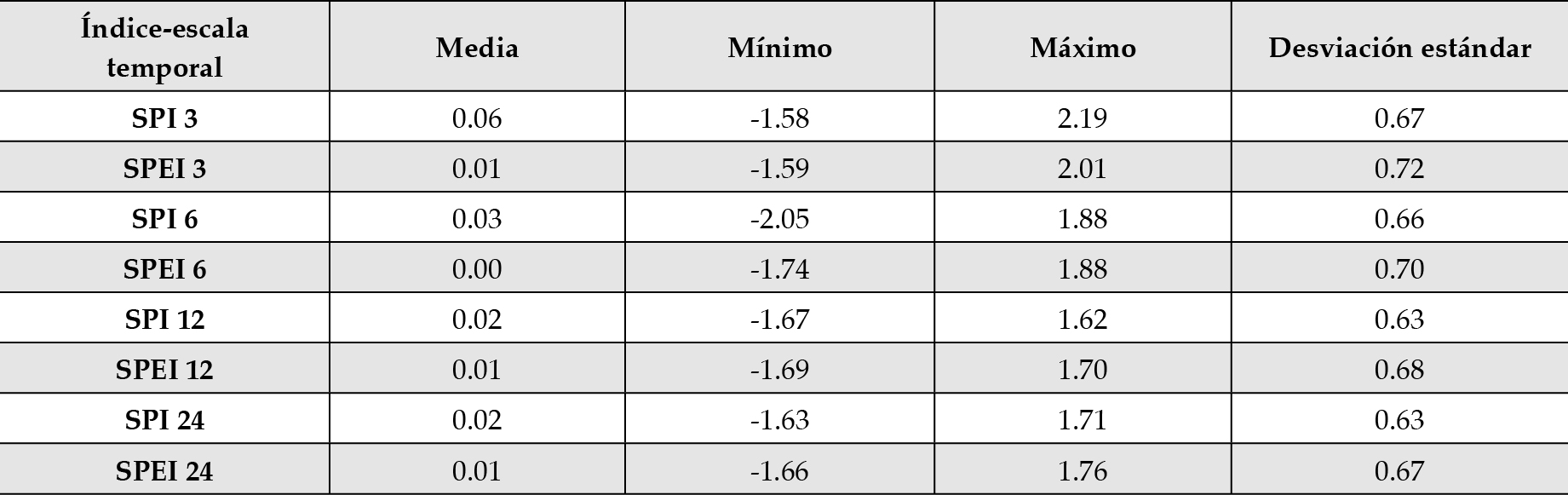 El número de sequías que se presentaron en las series de los índices SPI y SPEI se redujeron a medida que aumentaba la escala temporal del índice. Las escalas de 3 y 6 meses presentaron eventos de sequía de moderada a extrema de corta y mediana duración; en cambio, a escala de 12 y 24 meses, presentaron sequías moderadas y severas, con una duración de hasta 61 meses (SPEI 24).