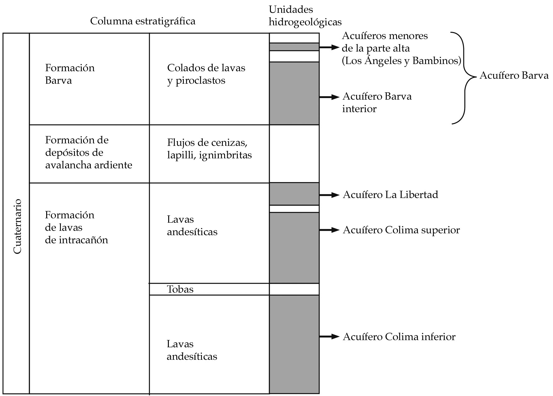 Columna geológica simplificada con las ubicaciones relativas de los miembros geológicos que comprenden el área de estudio. Sistema de acuíferos Barva (modificado de BGS/SENARA, 1988).