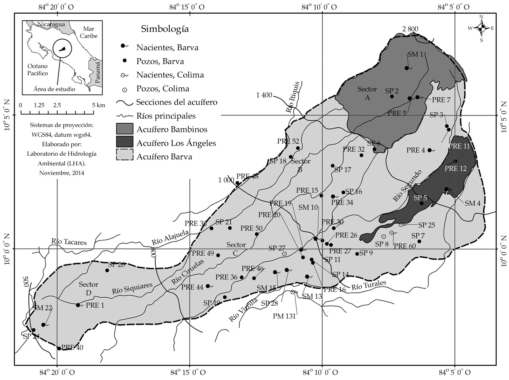 En la zona central y norte del Valle Central de Costa Rica se encuentra un sistema multiacuífero de origen volcánico, conformado por un acuífero superficial y libre, denominado acuífero Barva, y dos acuíferos semiconfinados: el acuífero Colima Superior y el acuífero Colima Inferior. Todo el sistema posee importancia fundamental para el abastecimiento de agua de las provincias de Heredia, Alajuela y San José. Para 2011 existían unas 177 640 viviendas en los distritos sobre el acuífero Barva (INEC, 2012). Esto representaba más de 700 000 personas abastecidas por medio de acueductos municipales, Asociaciones de Acueductos Rurales (ASADAS) o por la Empresa de Servicios Públicos de Heredia (ESPH), con agua de los acuíferos Barva o Colima. Además, otros acueductos captan agua de estos acuíferos y la transfieren a otras localidades fuera de la Gran Área Metropolitana (GAM), como hacia la ciudad de Puntarenas, en el Pacífico central. A pesar que el agua de estos acuíferos aún se considera de buena calidad física y química, un estudio realizado por Reynolds-Vargas, Fraile-Merino e Hirata (2006) sugiere que las concentraciones de nitratos han aumentado en algunos sitios del acuífero Barva. Por un lado, esto refleja una vulnerabilidad intrínseca del acuífero a la contaminación, la cual puede ser de baja a alta, según el sector estudiado. Ello se evidenció en un estudio sobre la vulnerabilidad hidrogeológica de un sector del acuífero Barva (Gómez-Cruz, Núñez-Solís, Madrigal-Solís, & Calderón-Sánchez, 2014). Por otro lado, la presencia de fuentes puntuales, lineales y difusas con potencial de generación de carga contaminante sobre el acuífero representa una amenaza a la calidad del agua subterránea, tal como lo indica una investigación en el sector norte del acuífero (Madrigal-Solís, Fonseca-Sánchez, Núñez-Solís, & Gómez-Cruz, 2014).