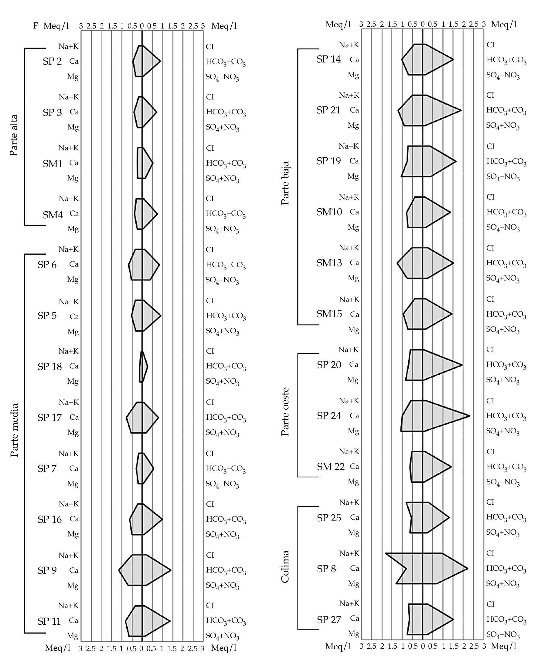 Diagramas Stiff representando las concentraciones promedio, en meq/l, en las muestras de los sitios de la red de monitoreo para el acuífero Barva y Colima.
