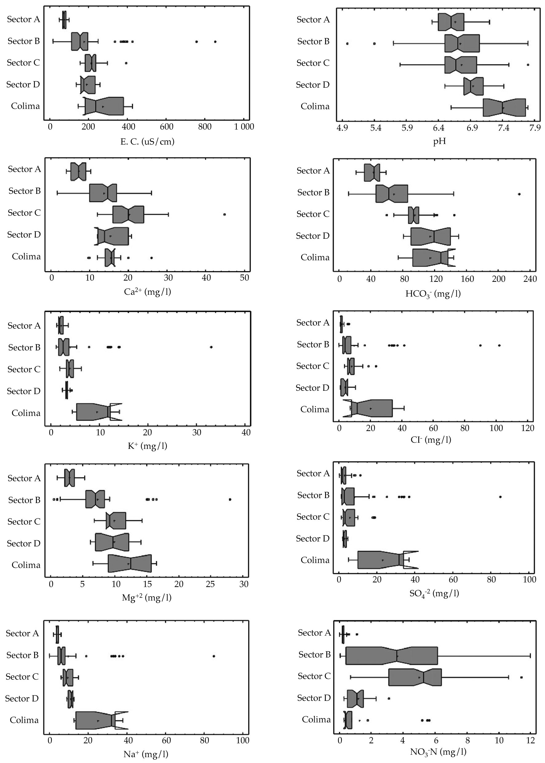 Por su parte, a pesar de que el agua del acuífero Colima forma parte de la misma familia hidrogeoquímica que el agua del Barva (figura 3), se encontraron concentraciones mayores de K+, Na+, SO4-2 y un pH mayor (p = 0, prueba Kruskall Wallis) en el acuífero Colima (figura 5). Los resultados de conductividad eléctrica, Mg+2 y HCO3- también son relativamente elevados, aunque no se encontró diferencia significativa con respecto a los datos de los sectores C y D, mientras que las concentraciones de Cl- y Ca+2 son relativamente bajas. Por su parte, las concentraciones de NO3-N de los sitios del Colima son bajos, similares a las concentraciones del sector A del acuífero Barva y al sector D de la zona de estudio (figura 5).