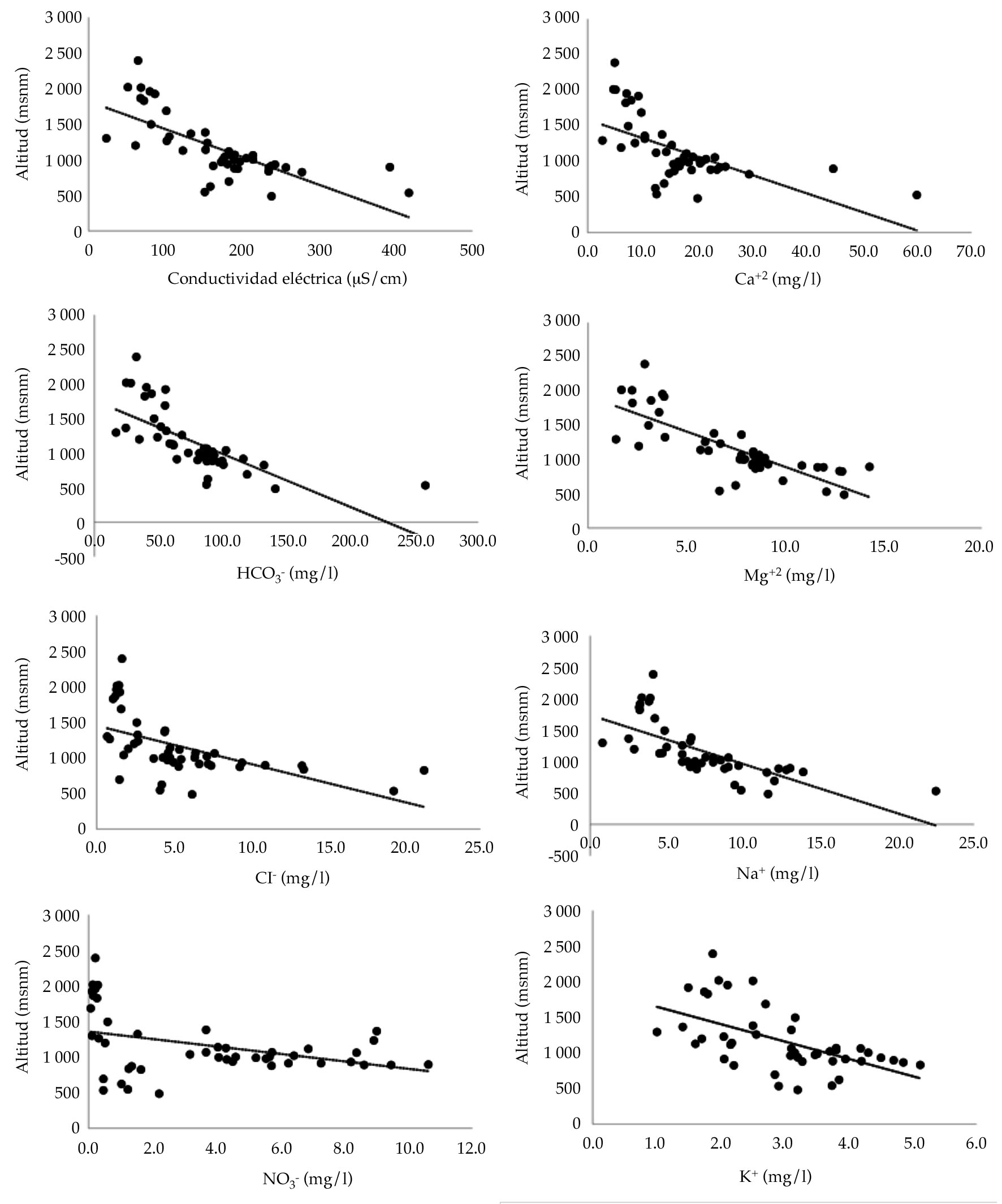 Además, se observó una diferencia entre los sectores A, B, C y D en cuanto a las concentraciones de algunos iones mayoritarios, especialmente en el ion HCO3- (cuadro 3, figura 4). Las pruebas Kruskall Wallis (p = 0 para todos los análisis) y los gráficos de caja en la figura 5 muestran un aumento significativo en las concentraciones de todos los parámetros (sector C > sector B > sector A), excepto en SO4-2 y pH. Al tomar solamente en cuenta los sitios ubicados en estos sectores del acuífero Barva se encontraron correlaciones negativas significativas (r entre 0.6 y 0.8; p < 0.05), entre la altitud y concentración de todos los parámetros, excepto pH y SO4-2 (cuadro 4 y figura 6).