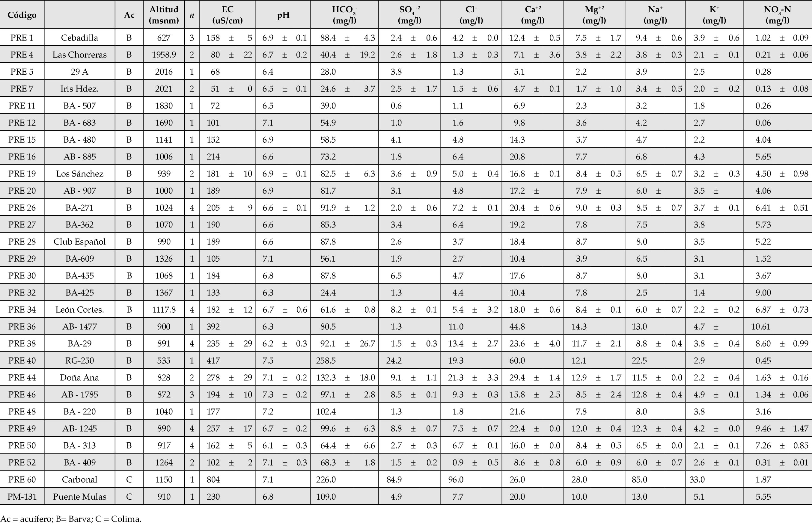 Promedios y desviaciones estándar en los parámetros físicos y químicos de 28 sitios de los acuíferos Barva y Colima.