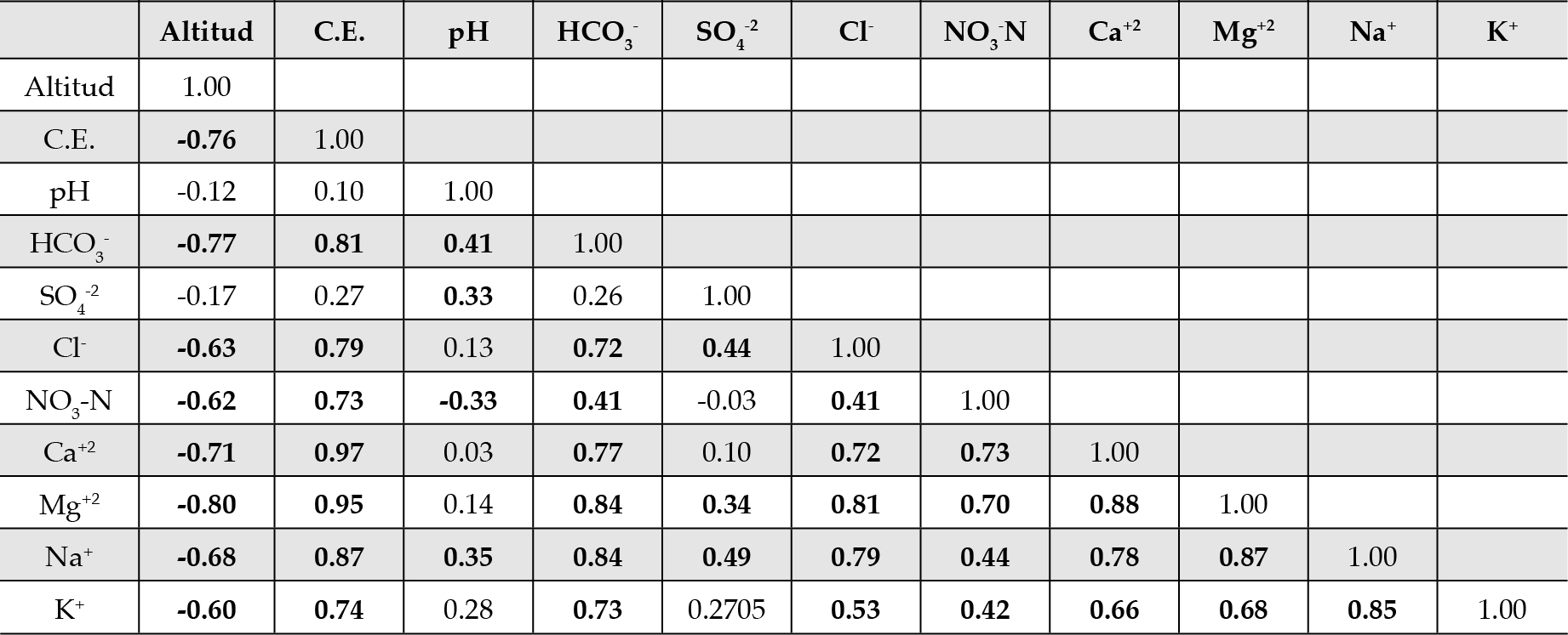 Matriz de correlación para los valores encontrados en los sitios de muestreo del acuífero Barva. En negrita los que mostraron significancia al p < 0.05.
