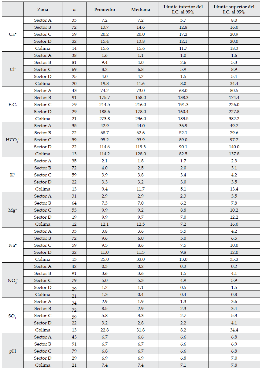 En el sector D, hacia el suroeste de la zona de estudio, se observó un aumento significativo en las concentraciones iónicas únicamente en el HCO3- y Na+ con respecto al grupo de datos del sector C, mientras que la conductividad eléctrica, Cl-, NO3-N, Ca+2 y K+ disminuyeron, y el resto de parámetros se mantuvo igual (p = 0 en todas las pruebas Kruskall Wallis) (cuadro 3, figura 5).