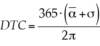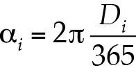 Para establecer los índices de estacionalidad (a, DMC y r) se comienza por transformar cada fecha de ocurrencia de las crecientes anuales a día juliano (Di); es decir, de 0 a 365. Lo anterior implica no considerar los años bisiestos. Las fechas de enero quedan igual, pero a las de febrero se les suma 31, a las de marzo 59, a las de abril 90 y así sucesivamente hasta las de diciembre, que se les agrega 334, para obtener el día juliano. Enseguida se obtiene el ángulo ai en radianes correspondiente a la fecha i de cada creciente (Di), con la expresión siguiente: