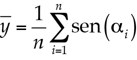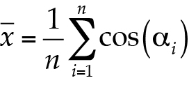en la cual, p es número pi, con 3.1415927 como valor aproximado. En seguida, las coordenadas x y y de las fechas de ocurrencia de las crecientes descritas por los ángulos ai se estiman con base en los cosenos y senos, y se obtienen sus valores medios, según las ecuaciones siguientes: