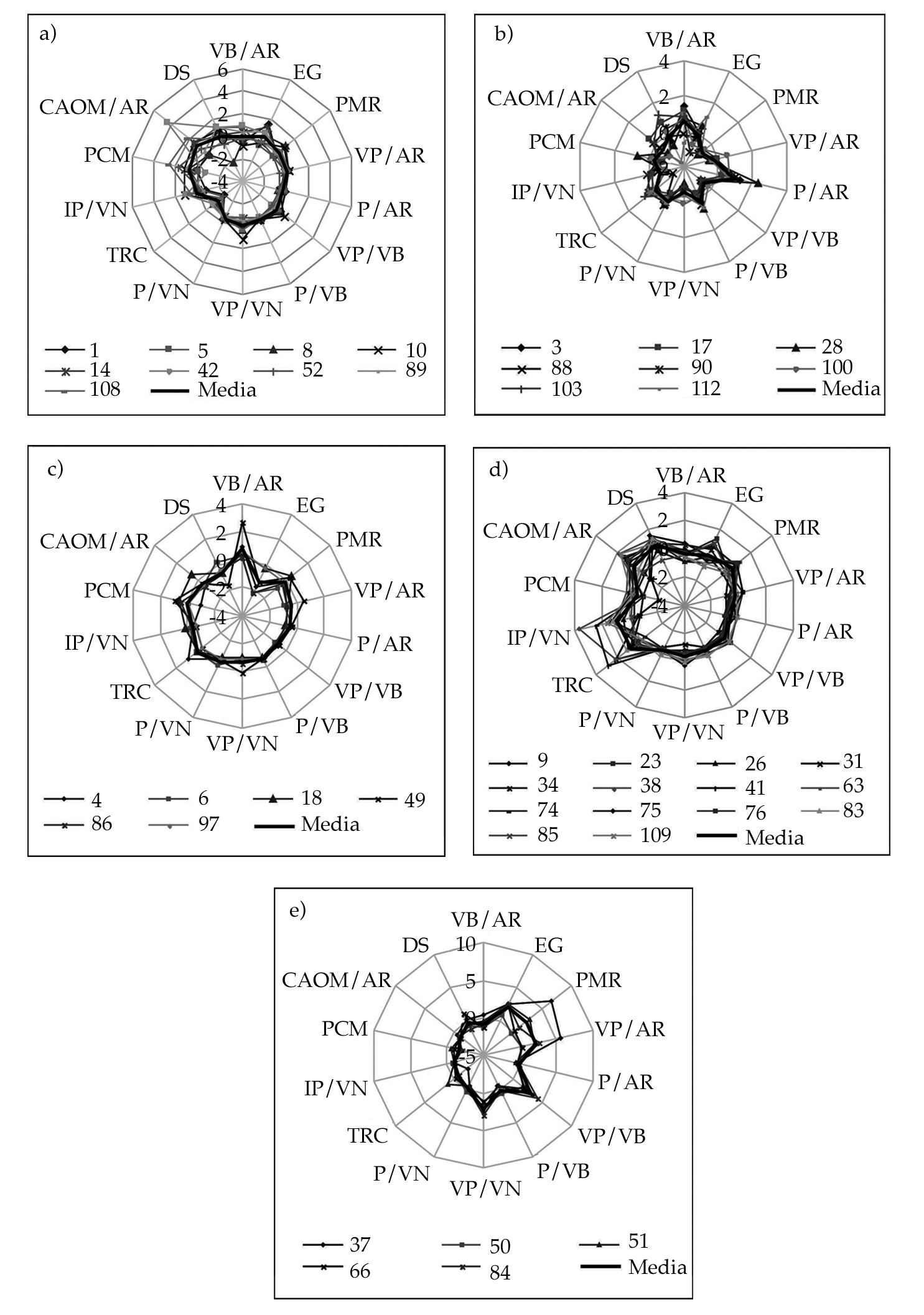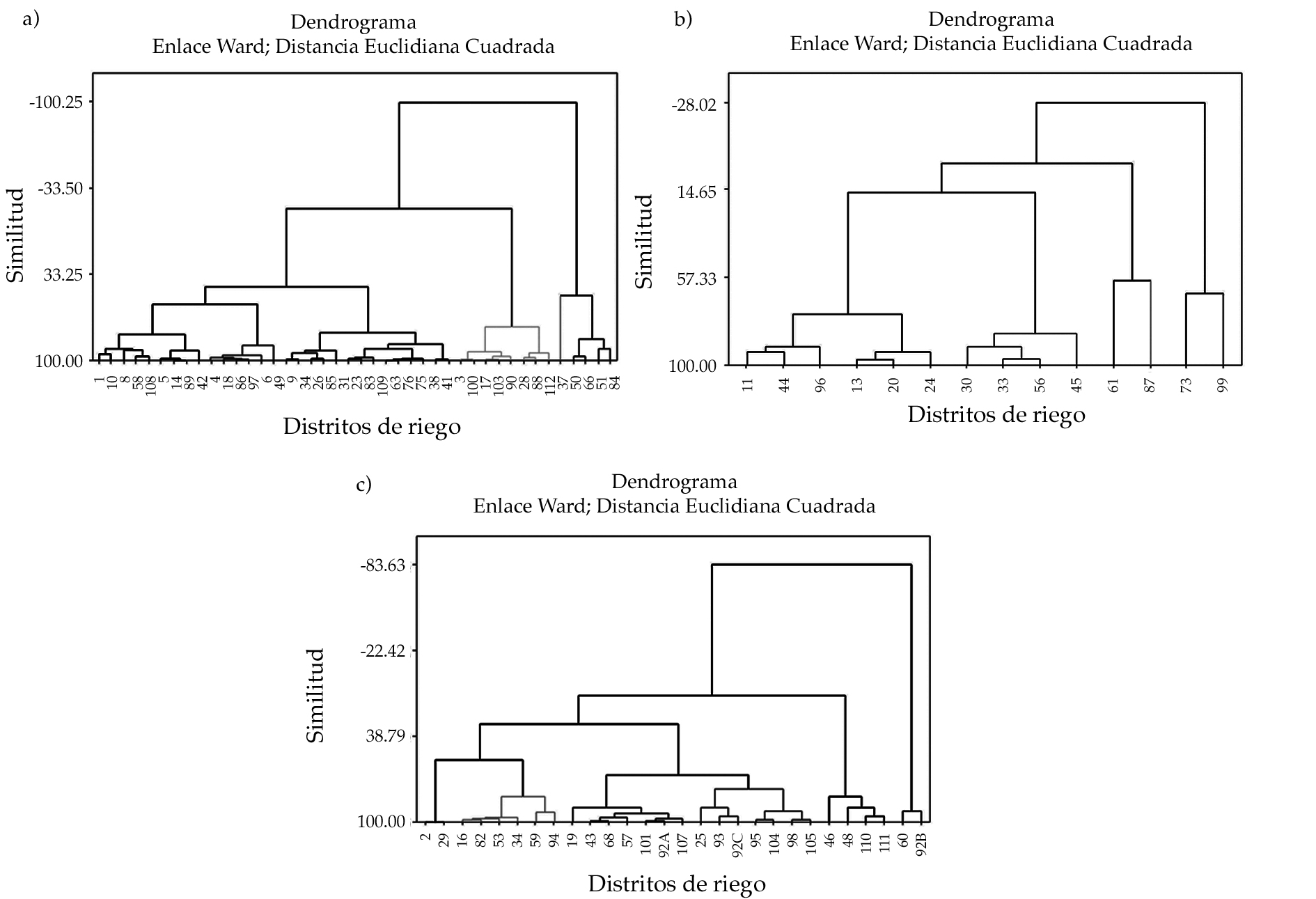 En el análisis de conglomerados por grupo climático, a través del enlace Ward, se utilizaron a los distritos de riego como casos y los valores de los componentes principales para cada distrito como variables. Los valores de los componentes principales se calcularon a partir de sus ecuaciones estimadas, sustituyendo en cada ecuación valores originales de los indicadores. El número de conglomerados se determinó tomando un porcentaje de similitud mayor a 70%. A partir de lo anterior, se obtuvieron los conglomerados S1, S2, S3, S4 y S5 para el grupo climático seco (figura 2a); los conglomerados TH1 y TH2 para el grupo climático templado húmedo (figura 2b). Los conglomerados TH3, TH4, TH5 y TH6, que corresponden a los DR 61, 87, 73, y 99, respectivamente, no se consideraron para el análisis posterior por estar constituidos por un solo distrito. Los conglomerados CH1, CH2, CH3, CH4, CH5 y CH6 se consideraron para el grupo climático cálido húmedo (figura 2c). El distrito 37 se unió al conglomerado conformado por los DR 50, 66, 51, 84, constituyendo el conglomerado S5.