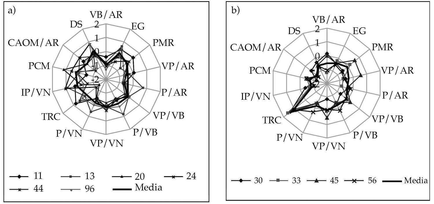 3. Se asignó un valor de desempeño para cada indicador, considerando su valor promedio, de acuerdo con las siguientes categorías de la escala arbitraria: muy bajo (menor que -2); bajo (de -2 a -1); regular (-1 a 0); medio (0 a 1); alto (1 a 2), y muy alto (mayor que 2).