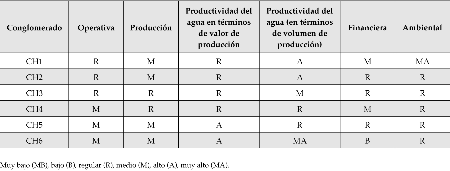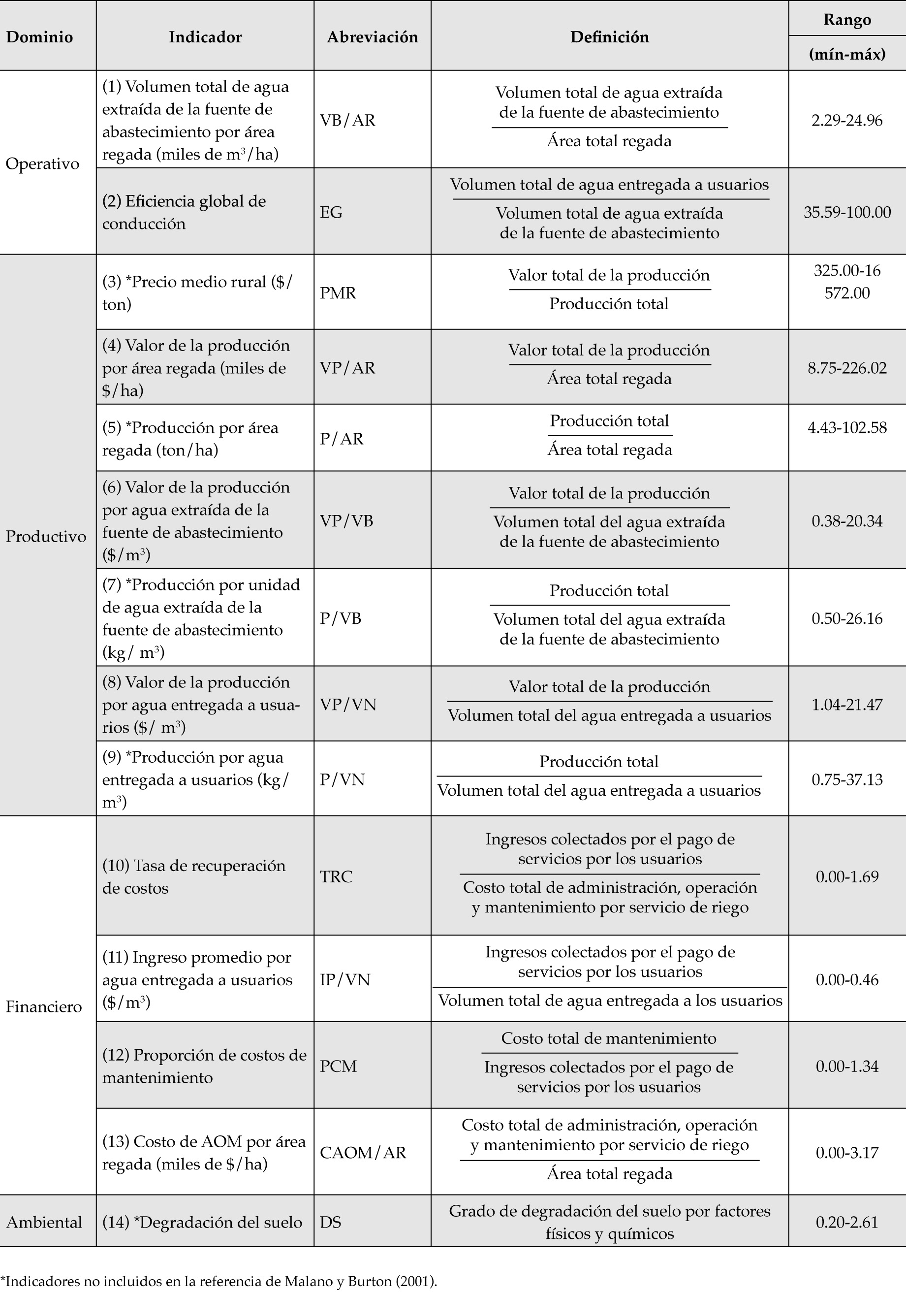 La evaluación del desempeño del riego se llevó a cabo a nivel de conglomerados, pues constituyen el menor nivel de agregación propuesto en este estudio. De manera general, el desempeño se evaluó de acuerdo con los siguientes dominios: operativo, expresado como eficiencia en la distribución y consumo del agua, a través de los indicadores VB/AR y EG; productivo, dividido en producción y productividad del agua. Para la producción se utilizaron los indicadores PMR, VP/AR y P/AR, para la productividad del agua, en términos de volumen de producción se utilizaron P/VB y P/VN, y para la productividad del agua en términos de valor económico VP/VB y VP/VN; financiero, se expresó en ingresos por administración, operación, mantenimiento de infraestructura y servicios del agua a usuarios, usando los indicadores TRC y IP/VN, y los costos de la conservación de la red de distribución del agua y costo del riego, a partir de los indicadores PCM y CAOM/AR. Para cada conglomerado se realizó lo siguiente: