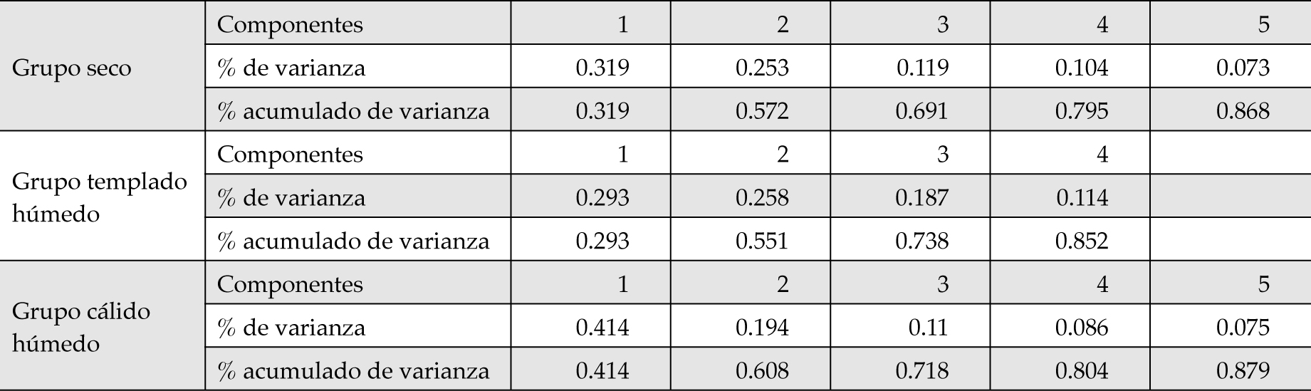 3. El análisis de componentes principales redujo el número de indicadores de 14 a 5 componentes para los grupos climáticos seco y cálido húmedo; y a cuatro para el grupo climático templado húmedo. Esta reducción en la dimensionalidad de los datos ayudó a disminuir la complejidad del análisis y facilitó la aplicación del análisis de conglomerados para la clasificación.
