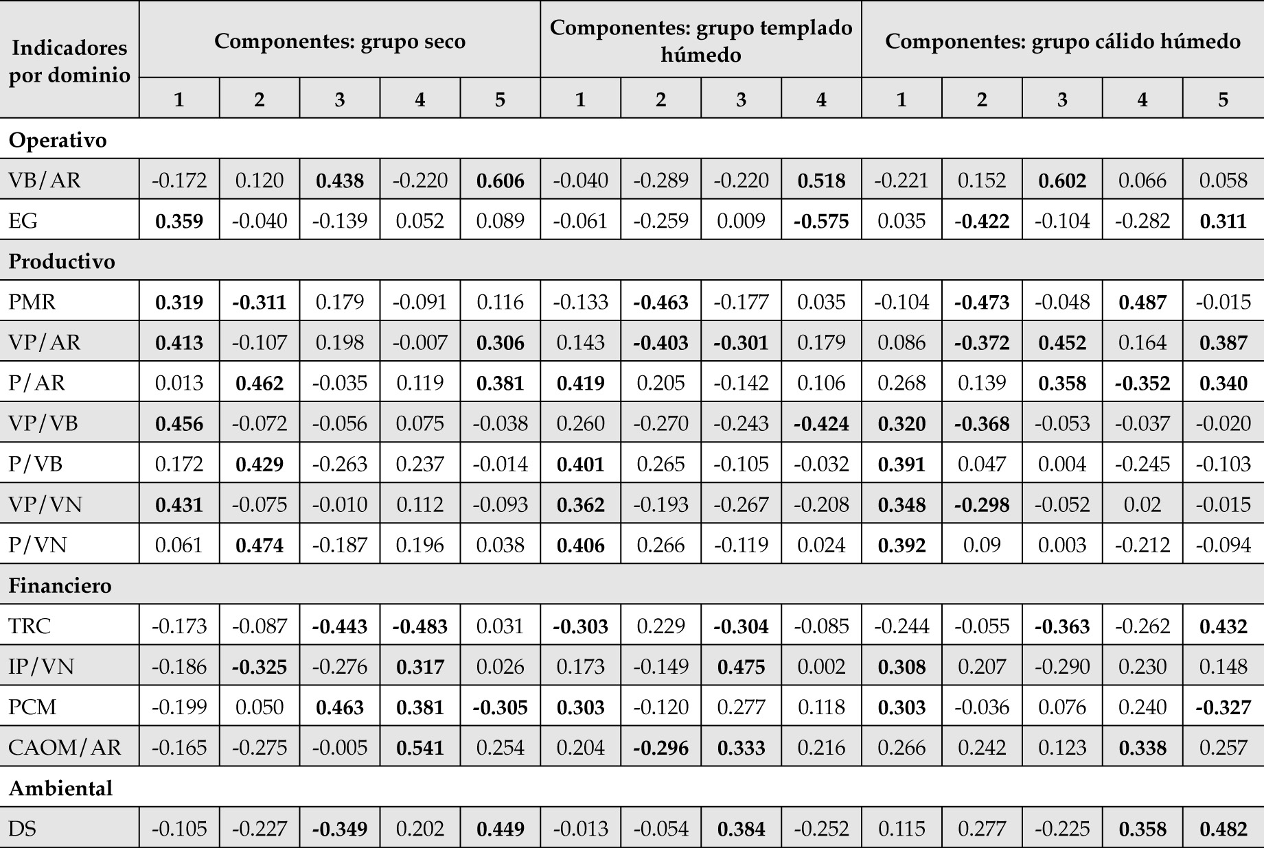 En el cuadro 3 se muestran los resultados del análisis de componentes principales por grupo climático. El número de componentes se determinó a partir del porcentaje acumulado de varianza, tomando como referencia un valor mayor a 85%. El cuadro 3 muestra una clara reducción en la dimensionalidad del análisis del desempeño de la gestión, al reducir de 14 indicadores a 4 y/o 5 componentes principales, facilitando el análisis de conglomerados para la clasificación de los distritos de riego. El cuadro 4 muestra las ponderaciones para cada indicador por componente y grupo climático. Se consideró que un indicador contribuye de manera importante al componente si su valor absoluto es mayor que 0.3.