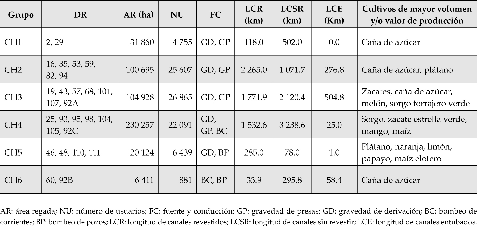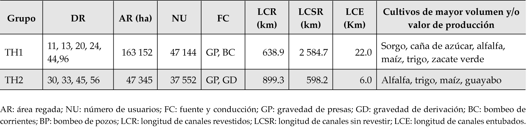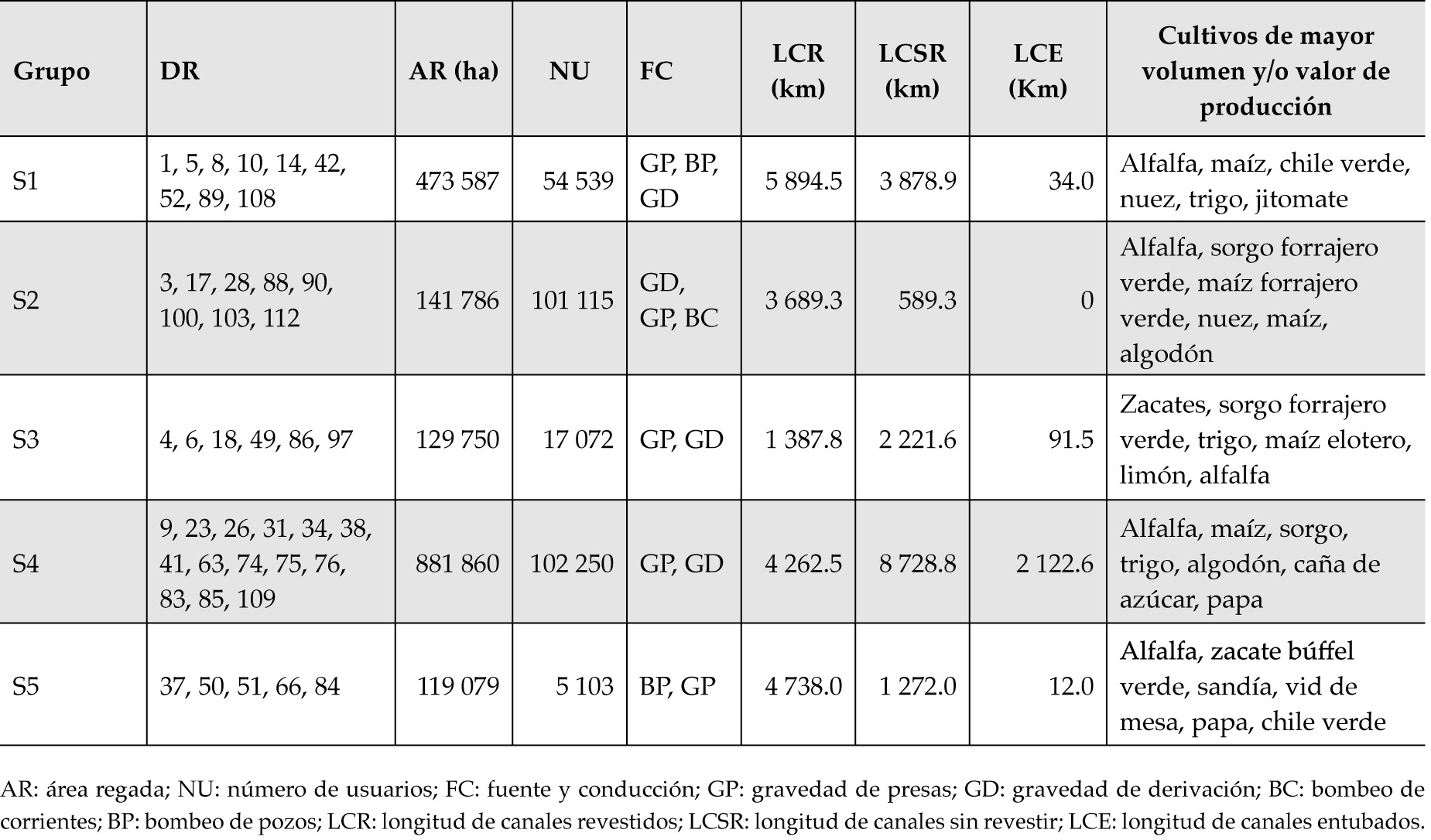 Asimismo, con la finalidad de complementar la caracterización de los conglomerados, se usaron las variables adicionales siguientes: área regada (AR), número de usuarios (NU), fuente y conducción (FC), longitud de canales revestidos (LCR), longitud de canales sin revestir (LCSR), longitud de canales entubados (LCE) y tipos de cultivos principales.
