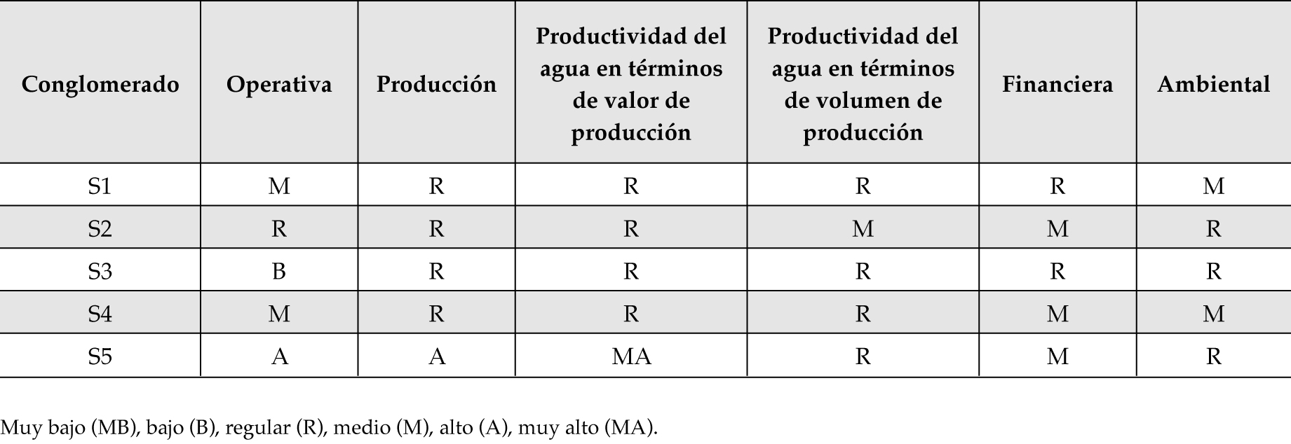 El conglomerado S5 presenta la mejor gestión del riego en este grupo climático (figura 3e, cuadro 6). Su buen desempeño operativo se explica por la baja cantidad de agua utilizada y pérdidas moderadas de agua en la conducción, lo cual puede atribuirse a su fuente de abastecimiento (pozos) limitada. En general, el dominio productivo es destacable por su alta productividad del agua en términos económicos, atribuible a cultivos (p. ej., vid mesa, chile verde y papa) de valor muy alto. El dominio financiero tiene una gestión desfavorable debido a bajos ingresos por servicios del agua. Finalmente, su dominio ambiental presenta un nivel aceptable.