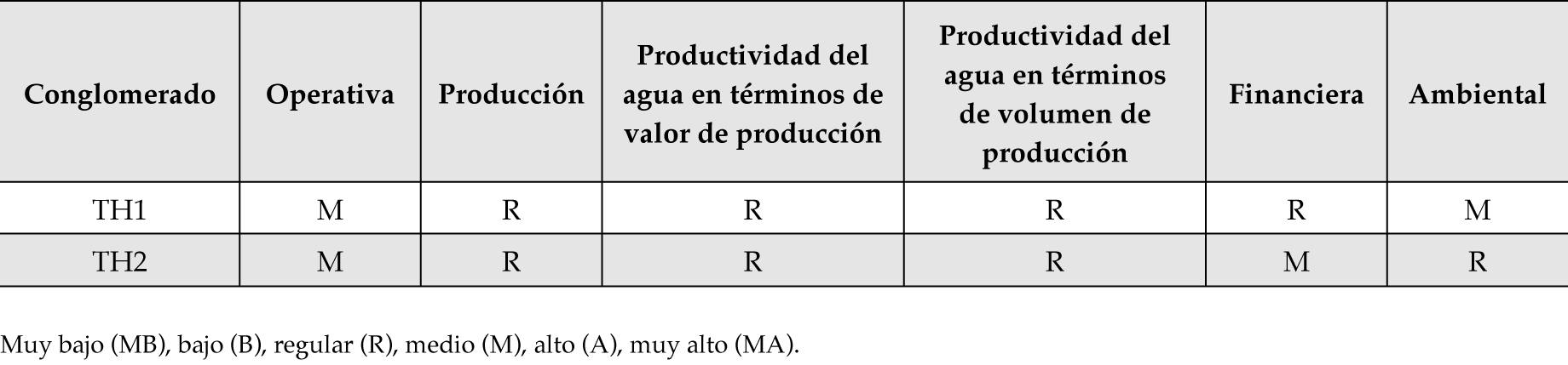 En general tiene un desempeño operativo y productivo deficiente, pero se caracteriza de forma positiva por tener suficiencia financiera; aunque sus ingresos son pocos, los costos de administración, operación y conducción de los distritos de riego también son bajos. El TH2 tiene un nivel de degradación del suelo aceptable (figura 4b, cuadro 8). Cabe mencionar que en este grupo destaca el distrito 45 por cultivar guayaba, un frutal con un valor económico alto.