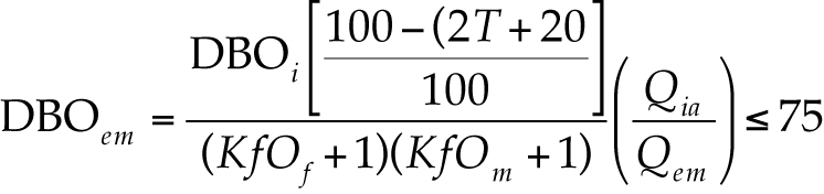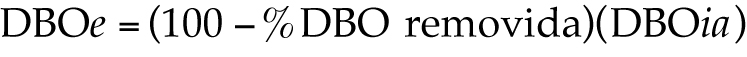 La expresión (41) se sustituye en la fórmula (26) por la DBOi, para obtener la DBOe en el efluente de la laguna de maduración, se corrige por evaporación y resulta la fórmula (42), la cual representa la restricción: