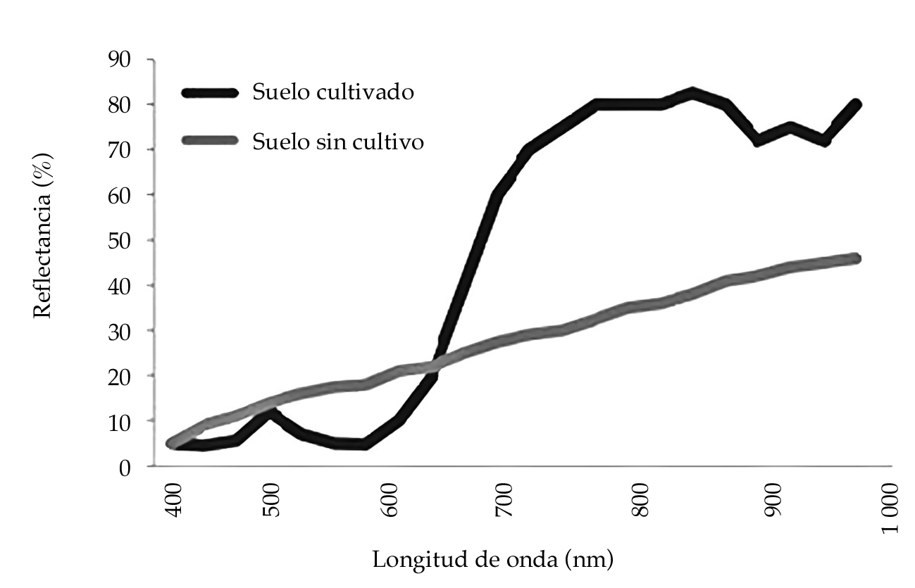 Las aplicaciones de los VANTs están estrechamente relacionadas con la percepción remota, en particular con la teledetección. Tradicionalmente, las plataformas para realizar esta tarea consistían de sensores montados en satélites, aviones y vehículos terrestres. La teledetección de variables agrícolas se basa en el principio de que la radiación reflejada por las plantas es inversamente proporcional a la radiación absorbida por pigmentos de la planta, y varía con la longitud de onda de la radiación incidente. La mayoría de los pigmentos, como la clorofila, absorben la radiación en el espectro visible de 400 a 700 nm (Pinter et al., 2003). En el caso de los suelos desnudos, la radiación se ve afectada principalmente por la humedad del suelo y el contenido de materia orgánica (Viscarra-Rossel, Walvoort, McBratney, Janik, & Skjemstad, 2006). El suelo desnudo y el dosel de los cultivos a menudo están presentes en una imagen espectral, y la mezcla de dos firmas espectrales puede confundir la interpretación de los datos de reflectancia (figura 2). De manera usual se recurre a la mezcla de dos o más regiones espectrales a través de índices espectrales, como el índice diferencial de vegetación normalizado NDVI (Deering, 1978), que resalta una característica de interés (vegetación) de la superficie terrestre y oculta otras.