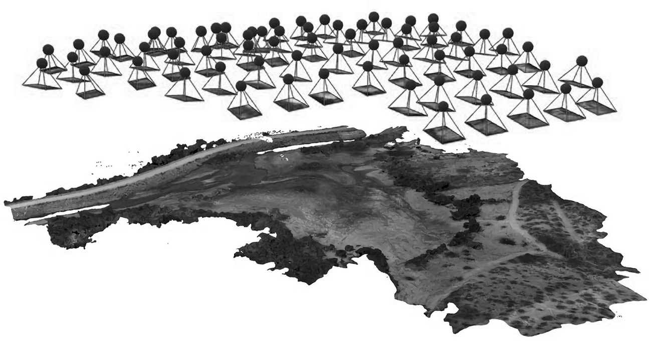 Modelo de elevación digital de un dique en Culiacán, México, construido a partir de imágenes tomadas desde un VANT. La imagen muestra las distintas posiciones de la cámara en la trayectoria de vuelo al momento de tomar las fotografías.