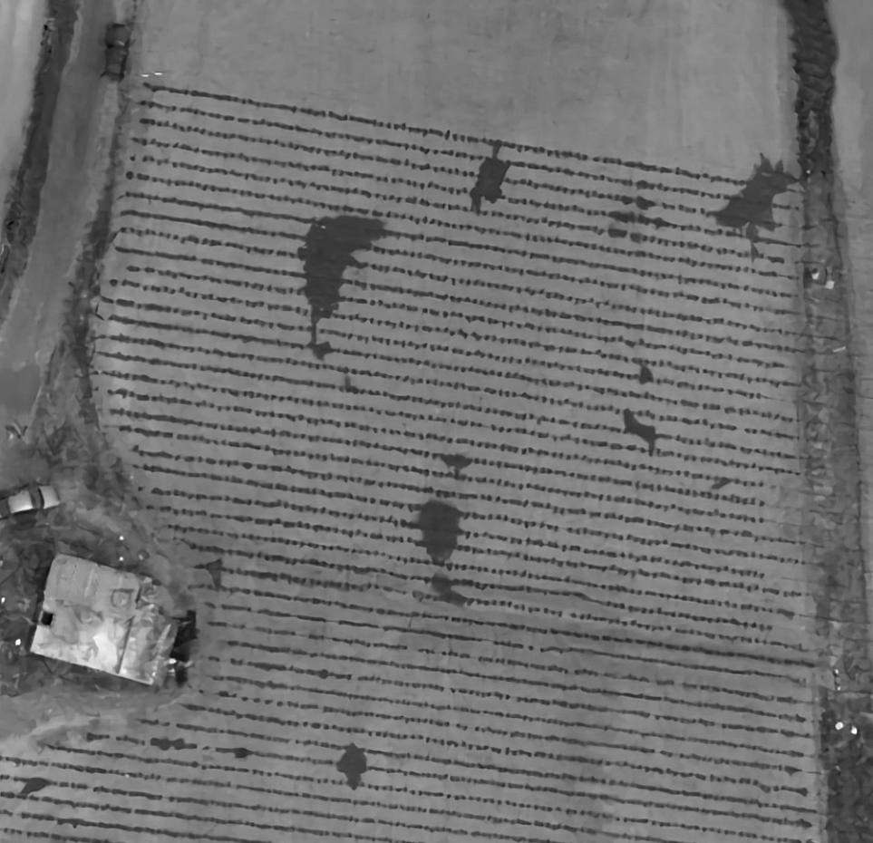 La gestión de una zona de riego implica una serie de actividades cíclicas durante el desarrollo de un año agrícola, asociada con actividades de planeación, implantación, monitoreo y evaluación. Sin duda, los VANT son una herramienta potencial para apoyar en la estimación de cultivos establecidos, conocer el estado del riego parcelario, detectar zonas de baja eficiencia de riego, y para una diversidad de actividades requeridas en el monitoreo y evaluación del servicio de riego a los usuarios. A nivel parcela, la aplicación de los insumos y manejo de los recursos son tareas que requieren de un monitoreo frecuente. Por ejemplo, la figura 4 muestra un ortomosaico obtenido de varias imágenes traslapadas, tomadas con un VANT durante la aplicación del primer riego con un sistema de riego por goteo, donde se aprecia una gran variación espacial de mojado en su aplicación. Sin duda, los vehículos aéreos pueden proporcionar información detallada para detectar anomalías, y evaluar la aplicación espacial y temporal del riego.