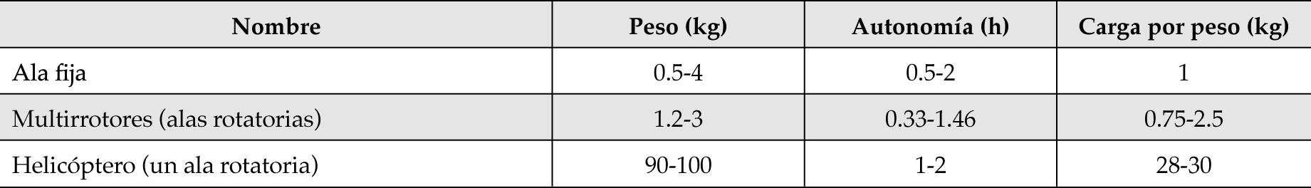 De acuerdo con Van Blyenburgh (2013), las diferencias generales por tipo de VANTs, con fines de monitoreo remoto, son las siguientes, expresadas en peso, autonomía y carga por peso (cuadro 1).