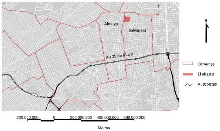 El barrio de El Abasto toma su denominación del colosalista edificio de estilo art decó donde se localizaba el antiguo mercado (de abasto) de Buenos Aires, en una localización progresivamente central como consecuencia de la expansión de la ciudad. Ubicado entre los distritos de Almagro y Balvanera se encuentra dentro del área de influencia del centro comercial tradicional de la ciudad (Once, dentro de la comuna de Balvanera) (ver figura 1).