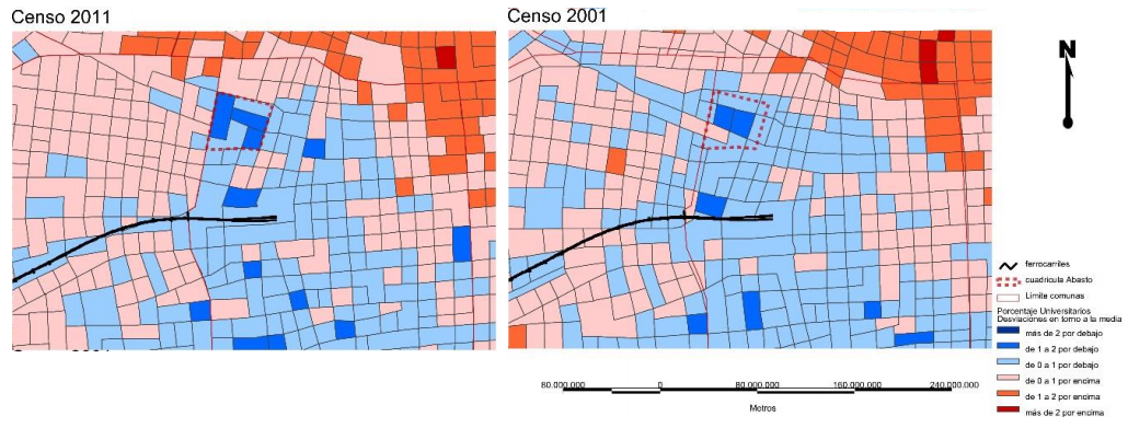 Los condominios de clase media han ocupado toda la peatonal de Carlos Gardel, con la única excepción de un viejo conventillo que muestra pintadas contra un posible desalojo en su fachada. Sin embargo, la mayor parte de las nuevas construcciones se han ubicado a la sombra de las tres torres country, donde las típicas operaciones en parcela se complementan con bares y boliches para un público joven y generalmente alternativo. Aunque la presencia de población joven y de clase media es notoria, los datos del censo no reflejaban una gentrificación contundente, lo que puede venir justificado por el limitado rango temporal que abarcan. En la figura 3, donde se representa un indicador fuertemente correlacionado con el estatus social como la proporción de población con estudios universitarios, se observa claramente la ubicación del sector en la frontera entre el norte rico de la ciudad y el sur más pobre. Entre 2001 y 2010 se constata una consolidación del entorno en valores altos para el indicador, especialmente al norte y al oeste del centro comercial, mientras que en las manzanas adyacentes, más identificadas con la toponimia de El Abasto, se conservan unos valores relativamente bajos, más propios del sector sur de la ciudad, de tal forma que en el periodo intercensal la zona ha quedado como una pequeña isla de valores bajos rodeada de sectores más o menos privilegiados de la ciudad (ver figura 3)