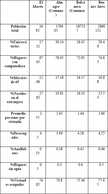 El entorno inmediato del Abasto, las cuadras inmediatamente al norte y al este, siguen formando parte del importante clúster de población inmigrante extranjera que se extiende desde el barrio de Once (Comuna Balvanera), con su epicentro en la plaza Miserere, y sigue habiendo constancia de precariedad habitacional en cuanto a la existencia de hogares sin suministro de agua y cierto grado de hacinamiento por la subsistencia de los conventillos. Los datos del cuadro 1 comparan el Abasto con las dos comunas entre las cuales se encuentra situado y con los datos para el conjunto de la ciudad. En términos generales para 2010, el sector seguía estando muy por debajo de la ciudad e incluso bastante por debajo de la comuna Balvanera para indicadores sociales como el porcentaje de universitarios o el porcentaje de hogares con computadora. Así mismo, la cuadrícula del Abasto se muestra como un sector caracterizado por un envejecimiento mucho menor que el del resto de la ciudad y de las zonas adyacentes, y por acoger una gran cantidad de población nacida en el extranjero, cercana al 30%. Mientras que la ocupación, el analfabetismo y el hacinamiento se encuentran ligeramente por encima de la de los distritos circundantes.