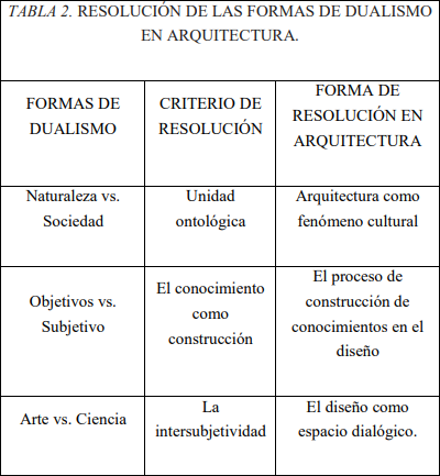 De lo anterior, se concluye que para superar el dualismo de Naturaleza vs. Sociedad en los estudios de arquitectura es necesario reconocer la unidad ontológica que plantea la relación de estas dos categorías y el concepto de arquitectura como fenómenos culturales. Ello quiere decir, en base al concepto de cultura expresado antes, que la arquitectura rinde cuentas de la relación Naturaleza- Sociedad bajos las formas y a través de los actores del proceso sociogenético que le dan origen.