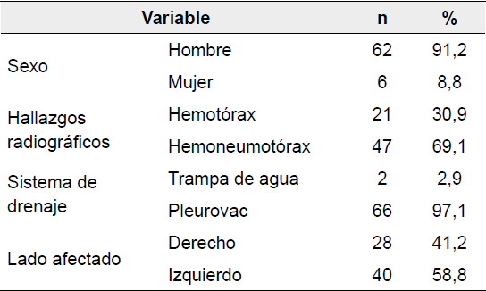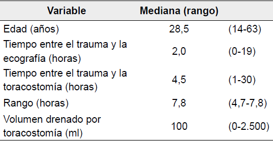 Durante el tiempo de la investigación, se practicó ultrasonido a 68 pacientes antes de someterlos a toracostomía cerrada. El 91,2 % era de sexo masculino y el hemoneumotórax fue la indicación más frecuente (69,1 %) de toracostomía cerrada. Las características de los pacientes se presentan en la tabla 1. La mediana del tiempo entre el trauma y las imágenes diagnósticas, y entre el trauma y la toracostomía cerrada, fue de 2 horas y 4,5 horas, respectivamente. Las otras variables cuantitativas se presentan en la tabla 2.
