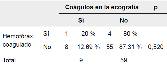 Se practicó ecografía de tórax a 68 pacientes que presentaron este tipo de lesiones y se encontró la presencia temprana de coágulos en 9 de ellos, de los cuales solo uno presento hemotórax retenido como complicación. El 1/9 de los pacientes con coágulos desarrollan hemotórax coagulado, en tanto que 4/59 de aquellos sin coágulos lo desarrollan (riesgo relativo, RR=1,65; IC95% 0,20-1,31).
