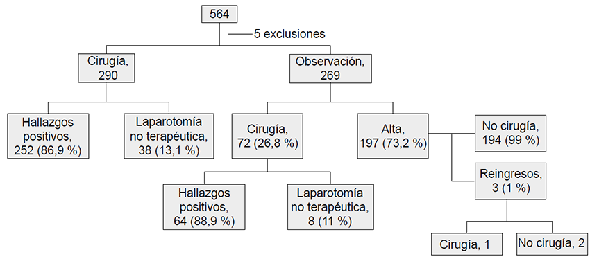 . Se practicó laparotomía exploratoria de urgencia en 290/559 (51,4 %) pacientes, 38/290 (13,1 %) de las cuales fueron laparotomías no terapéuticas. La sensibilidad del examen físico para la decisión quirúrgica emergente fue de 99,6 % y, su especificidad, de 80,99 %.