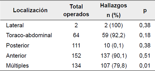 Del total de las lesiones, 216/559 (38,6 %) estuvieron localizadas en el abdomen anterior, 213 (38,1 %) fueron múltiples, 90 (16,1 %), toraco-abdominales, 34 (6,1 %), posteriores, y 6 (1,1 %), laterales. En 21,6 % (122/559) de los casos, hubo una o más lesiones asociadas en otras zonas anatómicas. En la tabla 1 se presentan la localización de la lesión y los hallazgos operatorios que requirieron reparación. La presencia de lesiones múltiples abdominales se asoció con menor probabilidad de lesión intraabdominal (p<0,05).