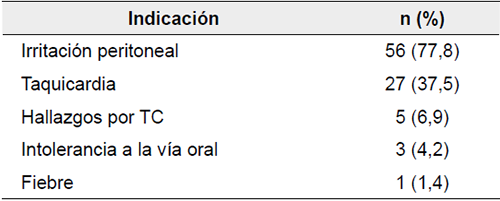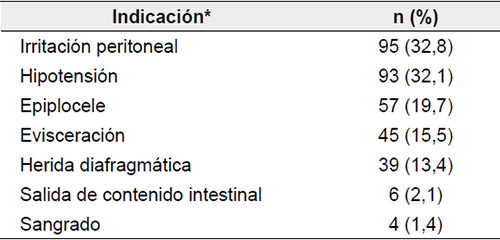 Durante la primera evaluación, 290/559 pacientes (51,4 %) fueron sometidos a procedimiento quirúrgico por los hallazgos del examen físico de ingreso, a 270/290 (93,1 %) de ellos se les practicó laparotomía exploratoria, a 15/290 (5,2 %), laparoscopia, y a 5/290 (1,7 %), procedimientos combinados (laparoscopia más laparotomía) (figura 1). La indicación de cirugía en estos pacientes fue, principalmente, la presencia de signos de irritación peritoneal (95/290, 32,8 %) e inestabilidad hemodinámica (57/290, 323,1 %) (tabla 2). Entre otros hallazgos en el examen físico que llevaron a tomar una decisión quirúrgica, se encontraron el epiplocele (57/290, 19,7 %) %), la evisceración (45/290, 15,5 %) y la sospecha de herida diafragmática (39/290, 13,4 %).